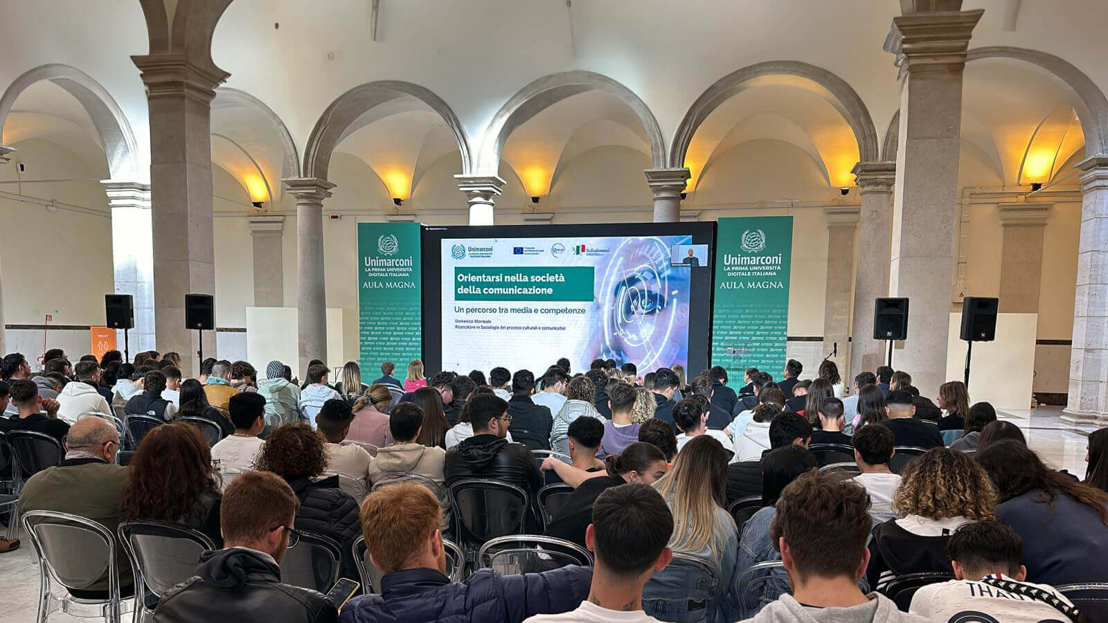 As part of the Active Orientation Project in the School-to-University Transition, the first orientation meeting was held at the Aula Magna of Unimarconi, with fifth-year students from Bianchini School in Terracina and Mattei Fortunato School in Eboli. This event marked the beginning of a series of three meetings aimed at guiding high school students towards an informed choice of their university career.